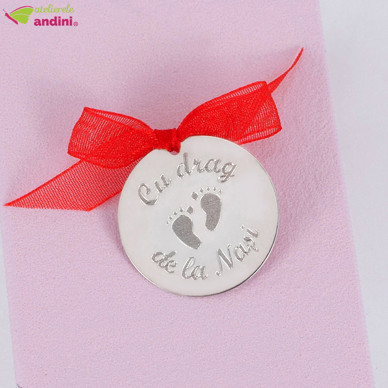 Bănuțul este personalizat cu mesajul „Cu drag de la Nași” și cu un simbol în formă de tălpi de bebeluș, prezintă o fundiță în culoarea dorită de client și este livrat într-un pliculeț elegant, alături de o brățărică simplă, roșie, reglabilă, perfectă pentru a alunga deochiul.