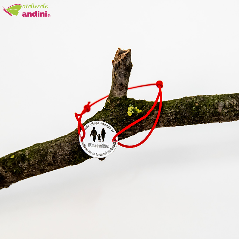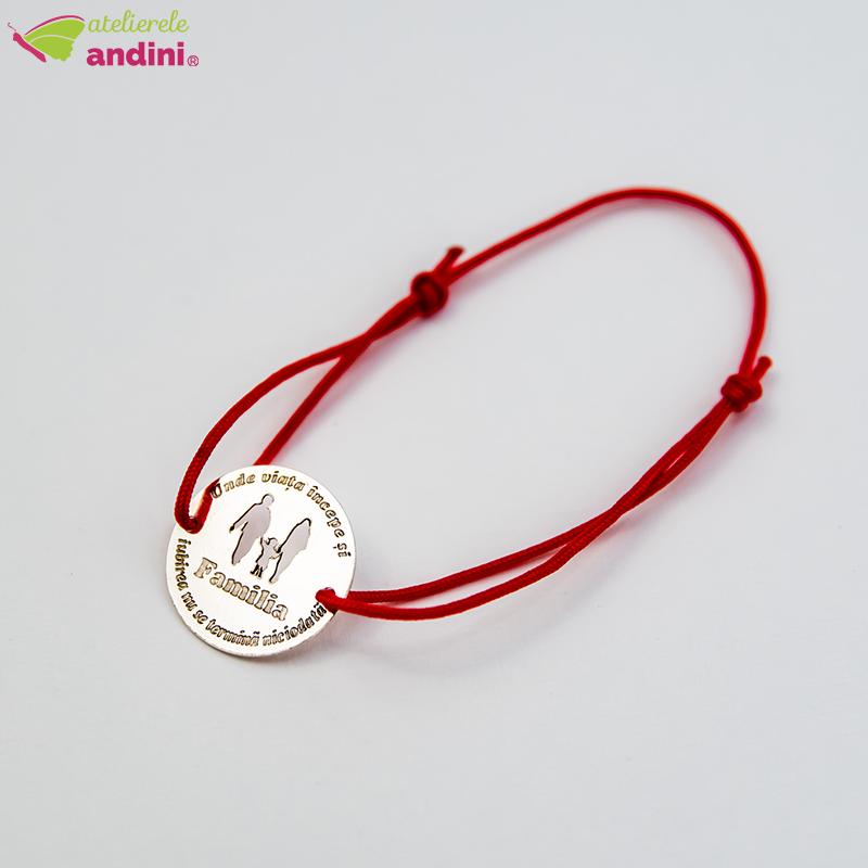 O brățărică roșie este întotdeauna o alegere perfectă atunci când îți dorești ca finuțul, copilașul, nepoțelul să fie ferit de deochi. Venim în ajutorul tău cu o brățărică delicată, confecționată dintr-un șnur roșu, reglabil și un bănuț din argint personalizat cu mama + tata + fetiță și textul „Familia – Unde viața începe și iubirea nu se termină niciodată!”