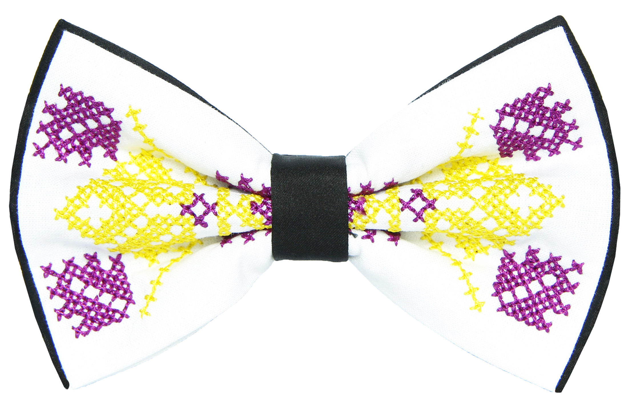 Carina – Mov cu galben, papion brodat, papion brodat cu motive traditionale, papion cu motive traditionale românești, papion din bumbac, negru cu alb