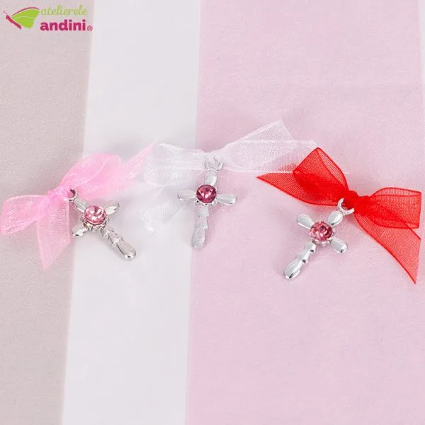 Un accesoriu ce nu trebuie să lipsească de la botez este reprezentat de cruciulițe. Acestea vin într-o varietate mare de opțiuni, atât în ceea ce privește culorile, cât și a modului în care sunt executate. Frumusețea stă în detalii, așa că acesta este un pas care nu trebuie grăbit! Vă rugăm să specificați culoarea fundițelor în rubrica Mențiuni Comandă!