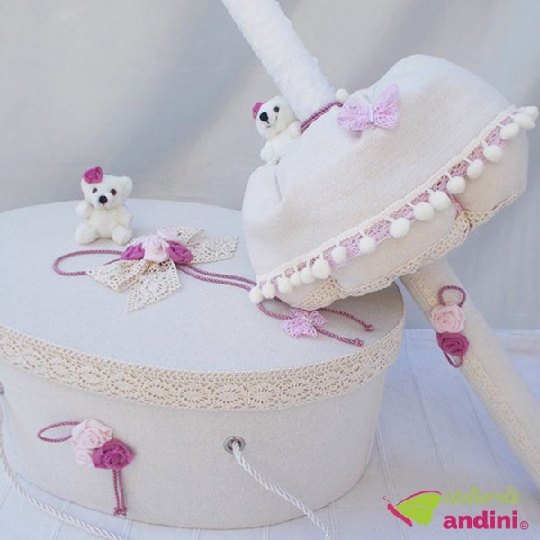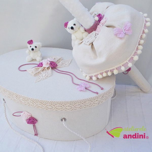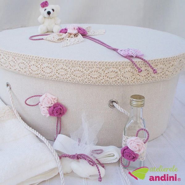 O fermecătoare și elegantă cutie destinată transportului trusoului de botez al bebelușului de acasă la biserică. Realizată din carton foarte rezistent, acoperită cu material textil, decorată cu dantelă și aplicații textile și ursuleț, pe nuanțe de alb și roz. Este prevăzută cu mânere din șnur gros și rezistent, iar în interior este căptușită cu satin. Cutia pentru trusou este practică și după momentul botezului, pentru a păstra amintiri din primul an de viață al bebelușului, jucării sau alte obiecte. Are formă ovală, cu dimensiunile de L = 49cm, l = 34cm, h= 21cm. La cerere, pe capac se poate inscripționa numele copilului, fără costuri suplimentare (cadou de botez din partea noastră).