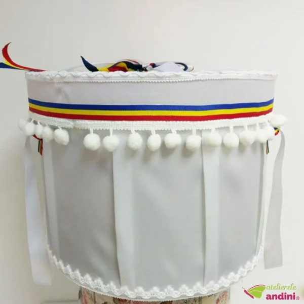 Această cutie de trusou este decorată cu ciucurași și panglici tricolore. Este destinată transportului trusoului de botez al bebelușului de acasă la biserică. Realizată din carton foarte rezistent, acoperită cu material textil și decorată cu dantelă, panglici și ciucuri albi. Este prevăzută cu mânere din șnur satinat, iar în interior este căptușită cu satin. Cutia pentru trusou este practică și după momentul botezului, pentru a păstra amintiri din primul an de viață al fetiței, jucării sau alte obiecte.