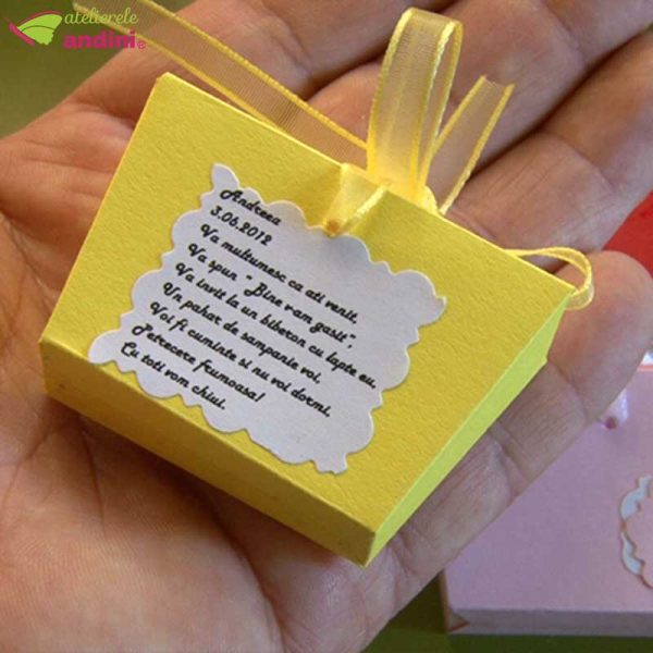 Alege o mărturie deosebită pentru botezul bebelușului tău, sub formă de gentuță. Cutiuțele sunt realizate din carton colorat, decorate cu floricele și personalizate gratuit cu numele copilașului + data botezului. Pot fi personalizate cu text sau fotografie pe una dintre fețe. Închiderea se face prin intermediul unei fundițe colorate, asortată cutiuței.