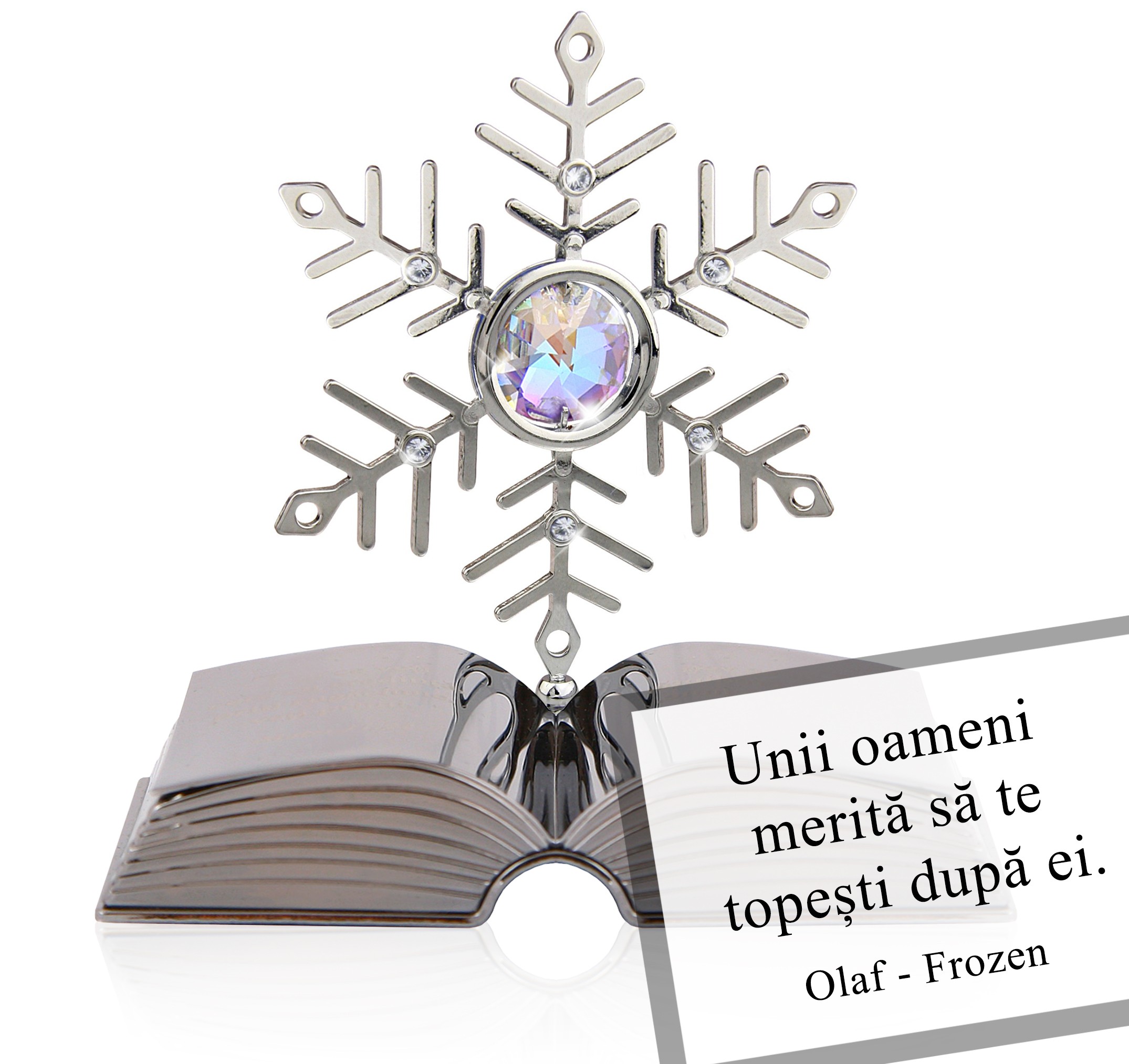 În prag de Crăciun îți propunem un cadou deosebit pe care îl poți oferi celor dragi. Alege o decorațiune deosebită, menită să adugă zâmbete pe buzele tuturor și multă armonie în cadrul încăperii în care este așezată. Acest model argintiu constă într-un fulg de nea decorat cu 6 cristale Swarovski mici de culoare bleu și unul mare în centru, atașat de o bază metalică în formă de carte.