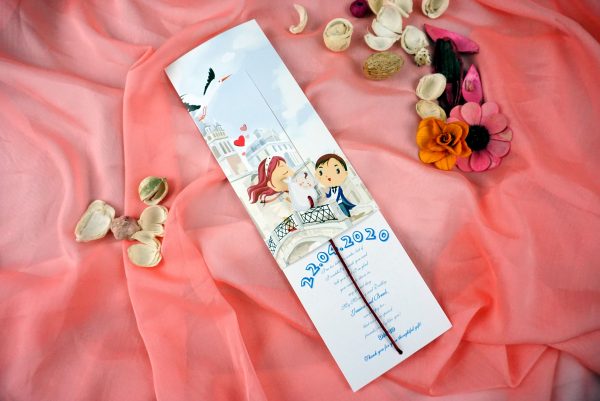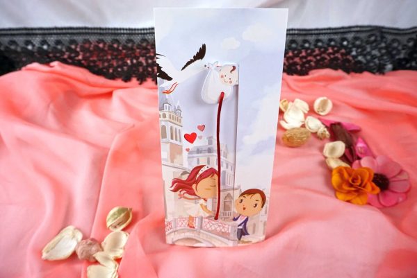 Invitatii de nunta si botez confectionate dintr-un carton lucios cu un bebe decupat care se prinde de o alta piesa care prezinta o imagine cu doi parinti. Cartonul cu bebelusul se poate misca astfel incat cade in bratele mamei si permite citirea textului. Invitatia nu contine plic.