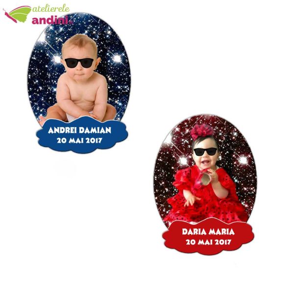 Alege o mărturie deosebită pentru botezul bebelușului tău și impresionează plăcut invitații frumosului eveniment. Poți opta pentru un model oval, plastifiat, personalizat cu nume bebe + dată botez sau cu fotografie.