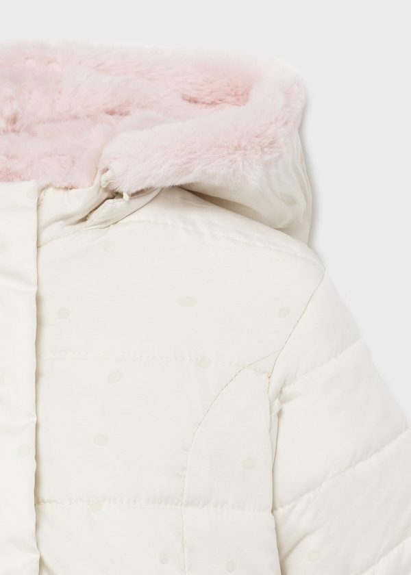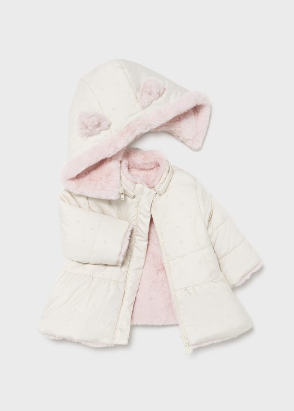 Paltonaș reversibil cu maneca lunga cu gluga detasabila cu detalii de blana. Model lung pana in talie. Inchidere centrala cu fermoar. Elemente decorative: aplicatii urechiuse.