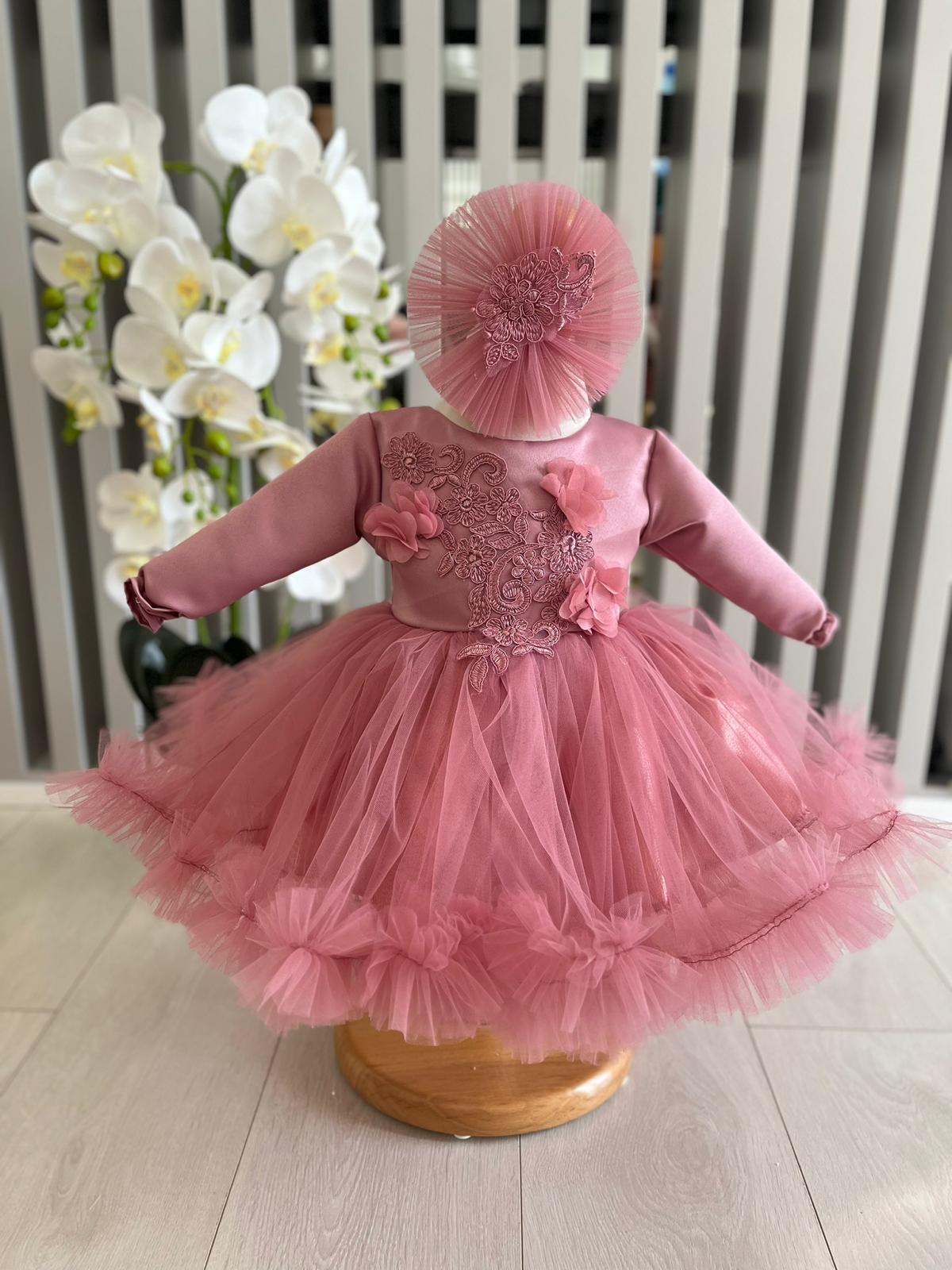 1. rochiță medie, realizată din mai multe straturi de tulle , satin si broderie  ( se poate realiza si cu maneca scurta )