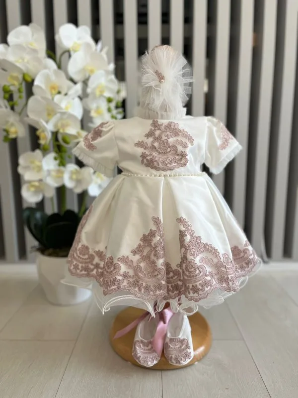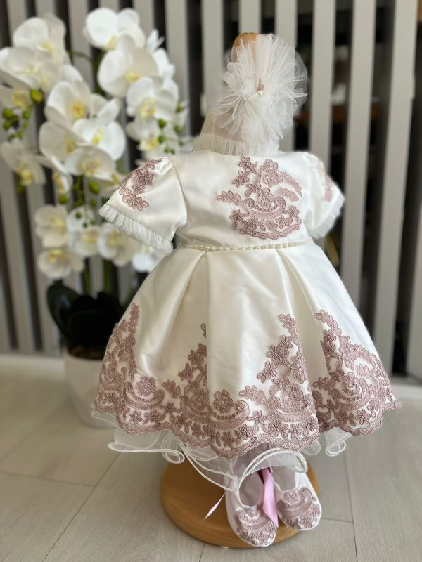 - rochiță medie, realizată din multe straturi de tull,tafta si broderie ; rochița este dublata cu bumbăcel, pentru a proteja pielea bebelușului