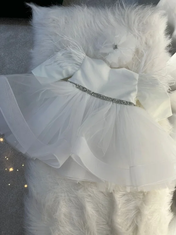 - rochiță medie, realizată din multe straturi de tulle,satin si pene; rochița este dublata cu bumbăcel, pentru a proteja pielea bebelușului ( se poate realiza si cu maneca scurta )