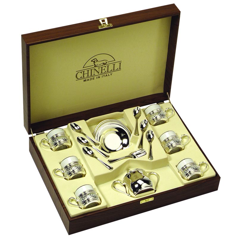 Acet set de lux pentru cafea este format din sase cesti din portelan de cea mai inalta calitate, placate cu argint.