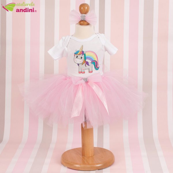 Micuța ta urmează să-și sărbătorească primul an din viață și vrei să fie în centrul atenției pe întreaga durată a evenimentului? Îți propunem să-i alegi o vestimentație mai aparte: un set compus din body personalizat și fustiță din tulle, realizată pe elastic și sistem fâșii. Personajul principal al acestei ținute este un simpatic unicorn, în spatele căruia răsare timid un frumos curcubeu.