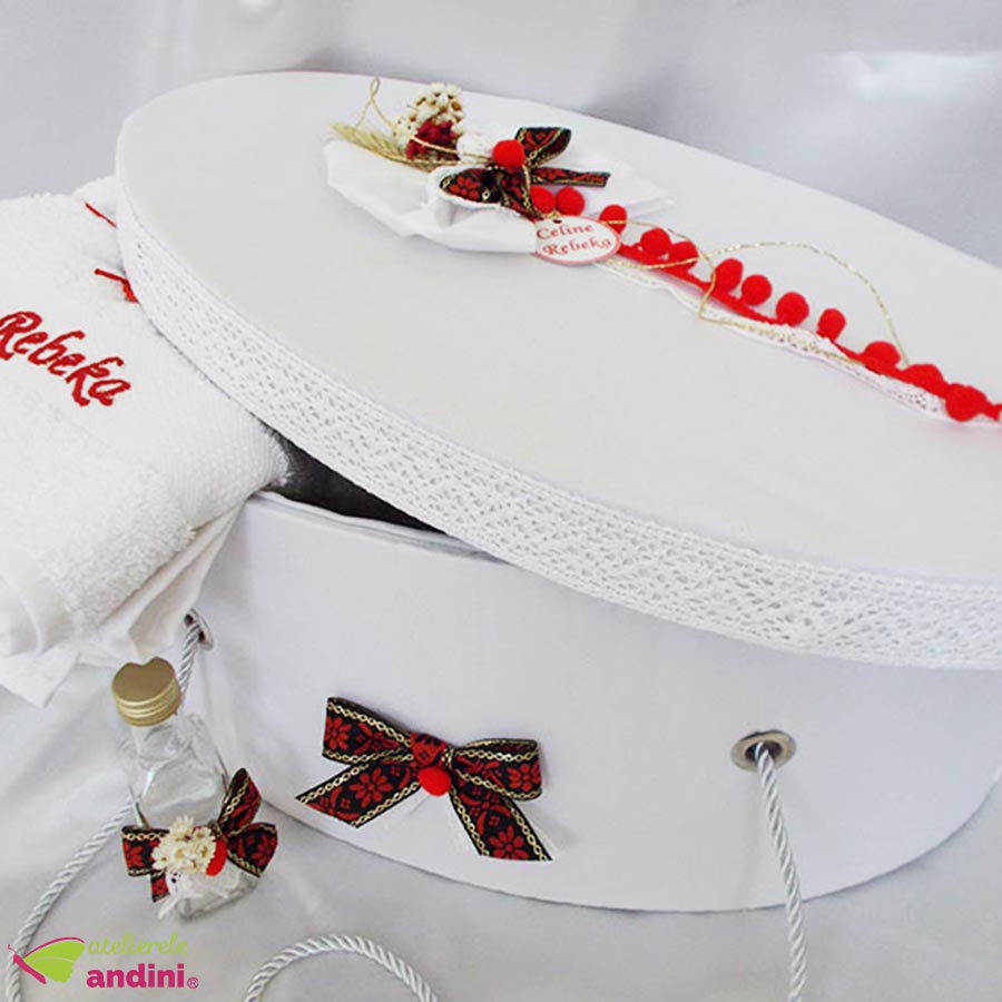 Tradition este un trusou de botez complet, format din 7 piese atent decorate cu elemente tradiționale românești. Pe lângă prosopele, pânză de mir, fașă și sticluță de mir, setul include și cutia de trusou decorată cu flori uscate, ciucuri, fundițe și personalizată în mod gratuit pe capac cu numele bebelușului.