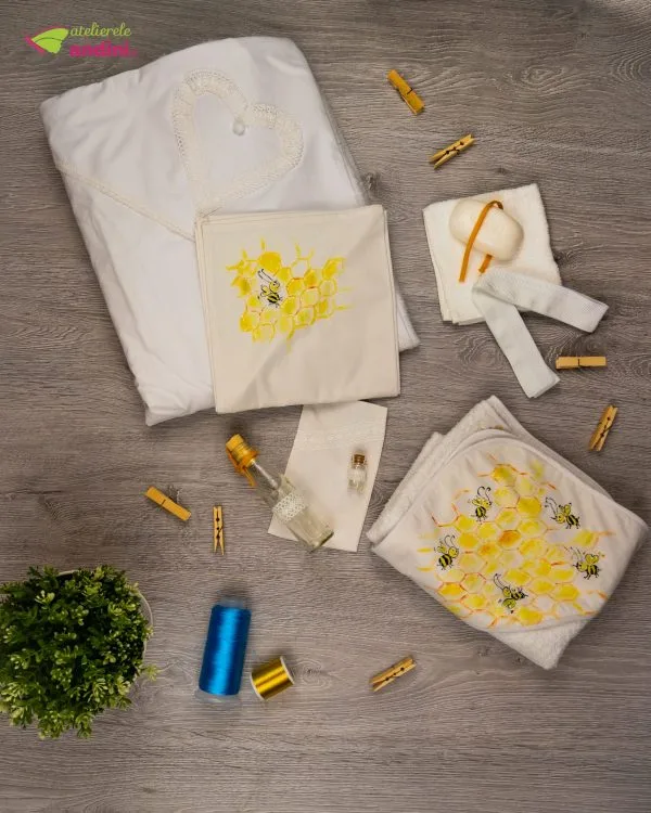 Propunerea noastră este trusoul pictat Albinuțe Harnice, un trusou delicat, pictat în diverse culori, perfect atât pentru fetițe, cât și pentru pentru băieței. Modelul este unicat, pictat manual cu acuarele speciale pentru textile, apoi tratat pentru fixarea culorilor. Te sfătuim să speli piesele la o temperatura de maximum 40 de grade, să eviți expunerea la soare și să le calci pe dos, ori cu o pânză subțire peste. Astfel, pictura va rezista mult timp.